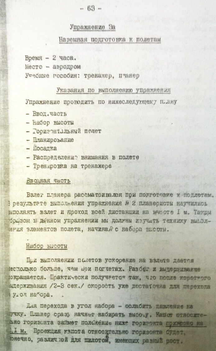 Взлет планера рассматривался при подготовке к подлетам. В результате выполнения упражнения №2 планеристы научились выполнять взлет и проход всей дистанции на высоте 1 м. Таким образом в данном упражнении мы должны изучить технику выполнения элементов полета, начиная с набора высоты.
